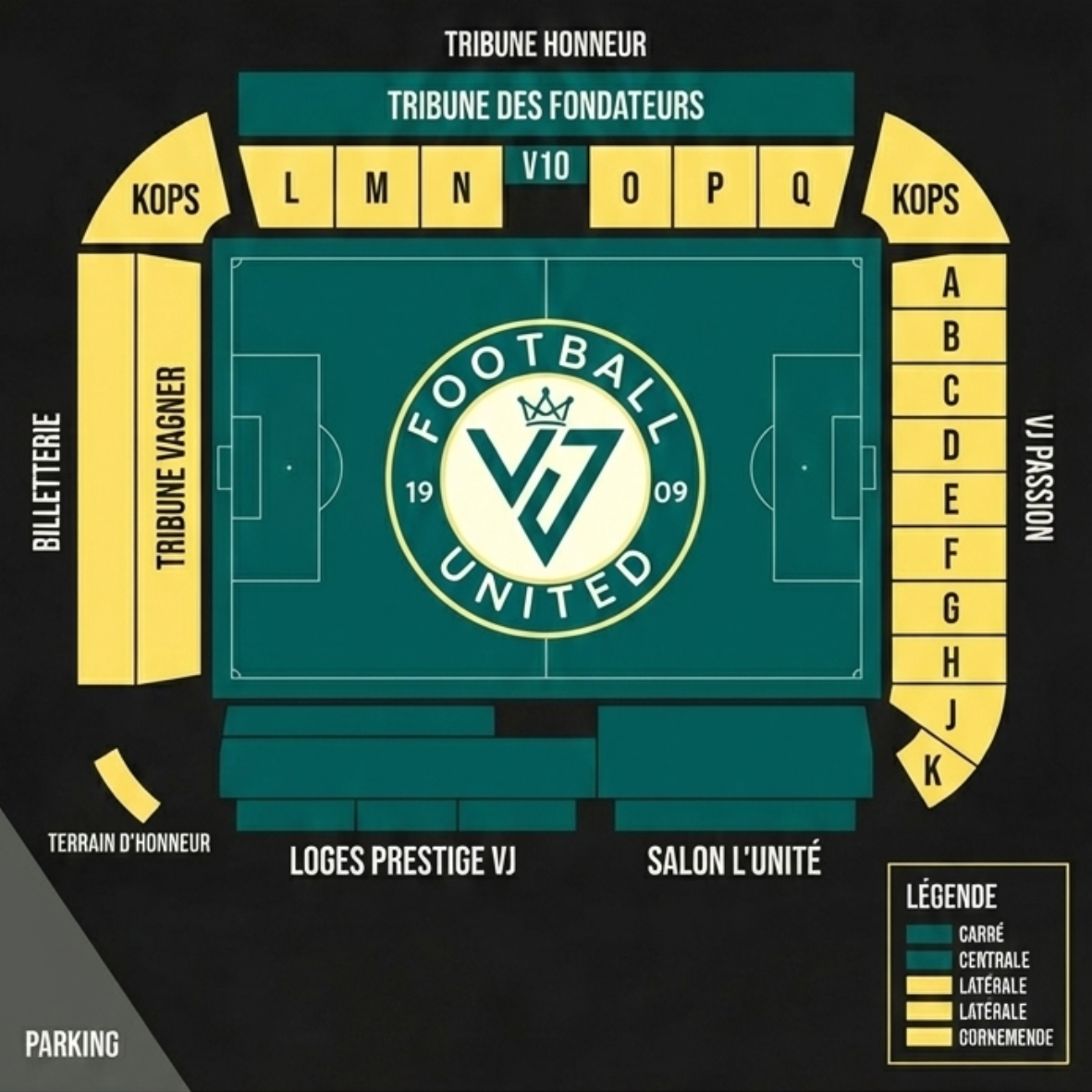 Tribune Vagner, Kops, Tribune des Fondateurs,  Loges Prestiges VJ,  A, B, C, D, E, F, G, H, I, J, K, L, M, N, O, P, G