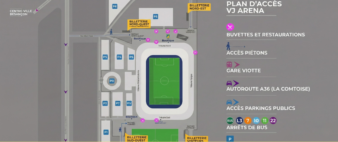 • Sécurité : L’accès au stade est soumis aux règles en vigueur (fouille et contrôles de sécurité).