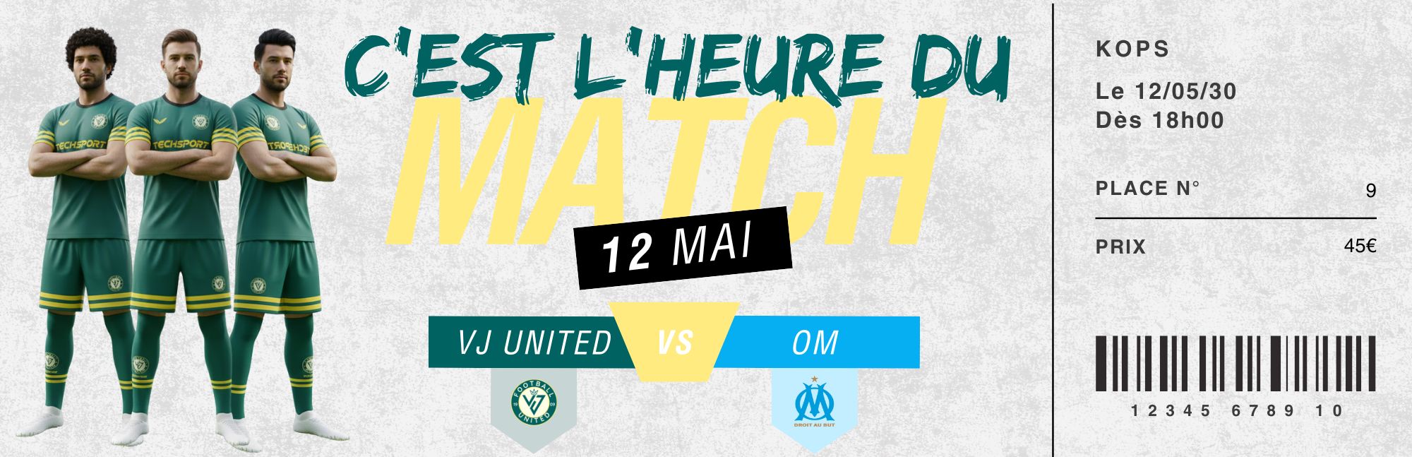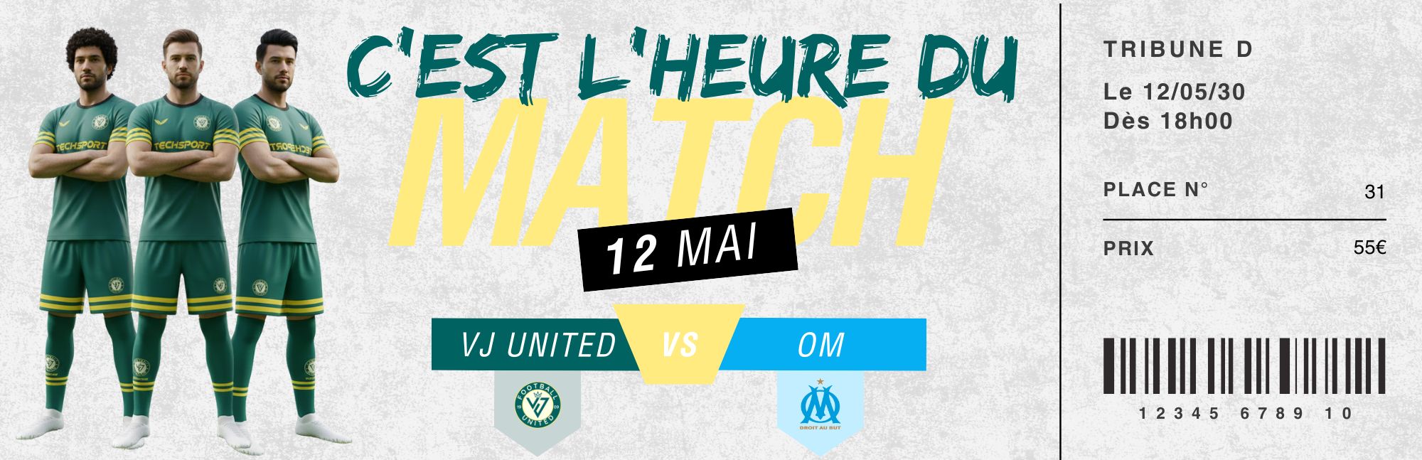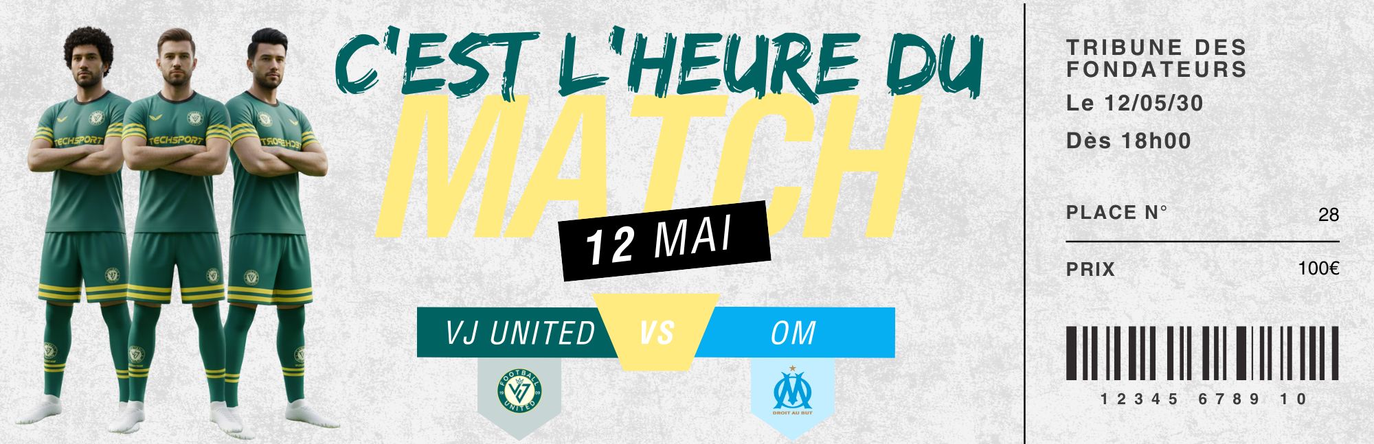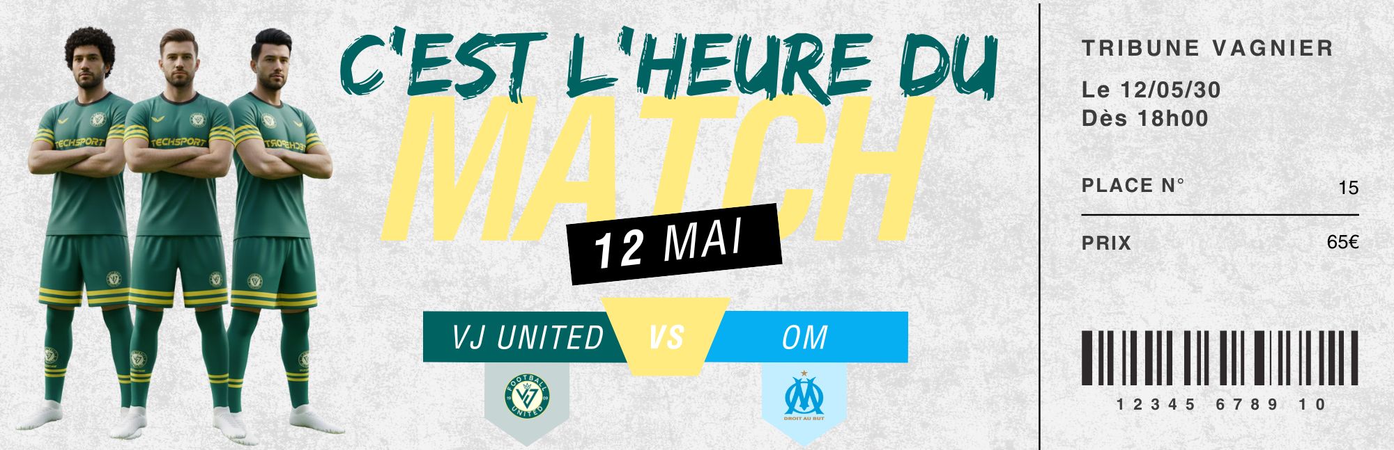 Préparez-vous à vivre une soirée inoubliable ! Le VJ United reçoit le prestigieux Olympique de Marseille (OM) le Dimanche 12 Mai dans son enceinte. Un match événement, électrique, où l’ambiance promet d’être à son comble. Ne manquez pas cette opportunité unique de soutenir nos joueurs contre l’un des clubs les plus emblématiques du football français.